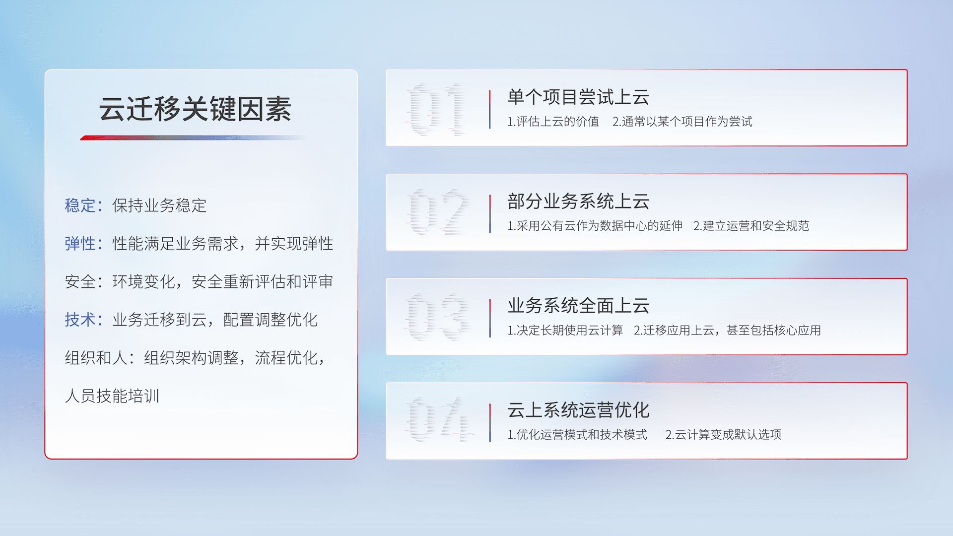 结合实际业务,,,,从规划设计、、、、云平台选型、、、云原生改造、、、数据迁移、、、、集成交付,,,迁移全过程为客户识别最佳上云路径,,,,做好风险识别管理,,,,设计网络架构、、身份权限、、、、安全审计合规、、、、操作审计、、、、日志审计、、监控告警策略、、、多站点容灾设计等,,对云上基础设施进行整体规划,,,提升IT治理水平,,,以满足弹性、、、高可用、、、、高性能的需求。。。。